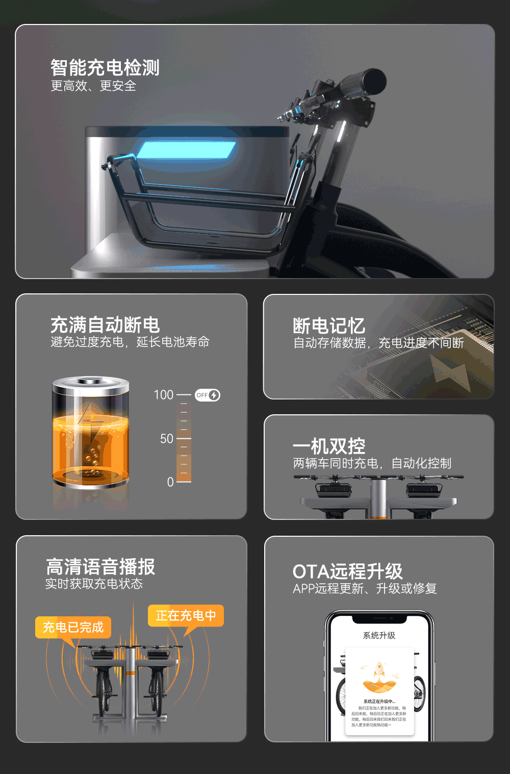 歐米智能無線充電樁最大特點是便攜充電,無需使用傳統的充電線連接,用戶只需將兩輪車停放在充電樁即,可實現自動無線充電,更加便捷,安全性能也提高,充電樁的鎖定機構可以有效識別車是否停放到位,以及確保車輛安全、防盜。高效充電性能也是采用先進的無線充電技術,充電效率高達90%。廣泛適用于各種類型的兩輪車,如電動自行車、電動摩托車等。